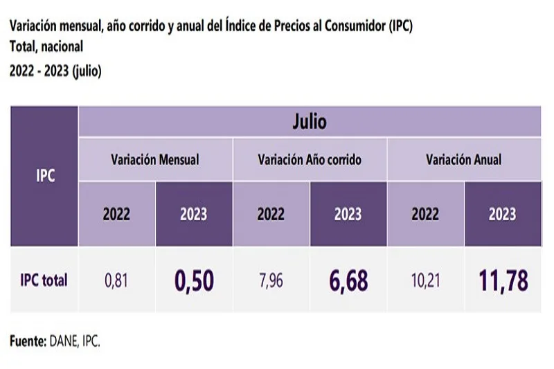 En julio de 2023 la variación anual del IPC fue 11,78%. El comportamiento anual del IPC total se explicó principalmente por la variación anual de las divisiones Alojamiento, agua, electricidad, gas y otros combustibles y Alimentos y bebidas no alcohólicas. La división Transporte registró una variación anual de 18,32%, siendo esta la mayor variación anual. En julio de 2023 los mayores incrementos de precio se registraron en las subclases: combustibles para vehículos (37,76%), vehículo particular nuevo o usado (19,00%) y compra y cambio de aceite (18,77%). Los menores incrementos de precio se reportaron en las subclases: compra de bicicletas nuevas o usadas (1,78%), peajes (2,53%) y transporte de pasajeros y equipaje en avión (3,59%).