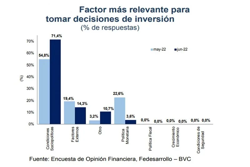 21 de junio de 2022Las condiciones sociopolíticas fueron el aspecto más relevante a la hora de invertir, pues el porcentaje de analistas que así lo considera fue de 71,4% (54,8% el mes pasado), según la Encuesta de Opinión Financiera de Fedesarrollo y la Bolsa de Valores de Colombia.