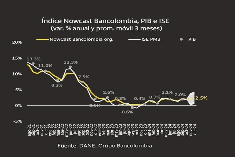 Así lo señala el Reporte NowCast Bancolombia donde se indica que los pronósticos de crecimiento del PIB para el 4T24 a partir de este indicador (2,5% anual) reflejan mayor optimismo sobre el desempeño de la economía frente a la expectativa del consenso de analistas, quienes en promedio prevén que, durante este último tramo del año, la actividad se expandió a un ritmo de 2,1% anual (sin cambios frente al mes anterior).