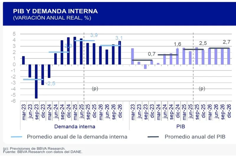 BBVA Research presentó su más reciente informe de actualizaciones económicas titulado «Colombia 2026: el futuro económico se piensa hoy”, en el que proyecta un crecimiento del 2,5% para Colombia en 2025 y del 2,7% en 2026, acercándose al ritmo potencial del país. Además, proyecta que el consumo privado lidere la dinámica interna en 2025, para luego moderarse progresivamente y dejar que la inversión fija, especialmente en edificaciones residenciales y no residenciales, asuma un papel más protagónico hacia finales de 2026.