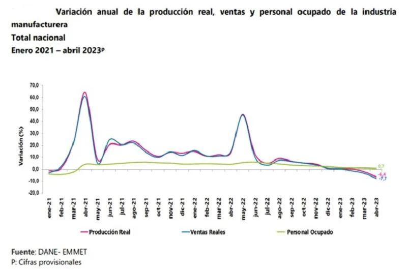 En lo corrido del año hasta abril de 2023, la producción real de la industria manufacturera presentó una variación de -2,0%, las ventas reales de -2,9% y el personal ocupado de 1,1%.
