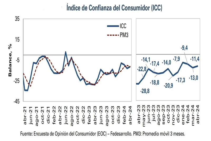 En abril el Índice de Confianza del Consumidor (ICC) experimentó un incremento de 1,6 puntos porcentuales frente al mes anterior (-13,0%), situándose en -11,4%, según los resultados de la Encuesta de Opinión del Consumidor (EOC), de Fedesarrollo.