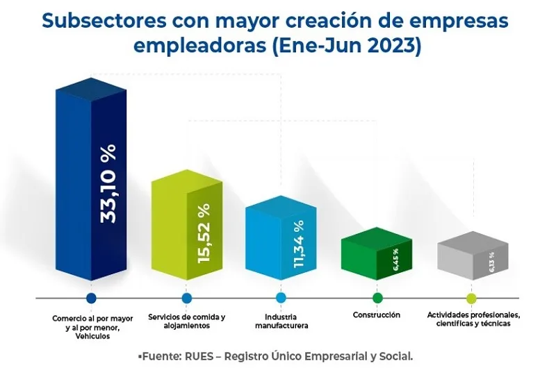 Del total de empresas, el 47,5% generaron al menos un empleo, lo que ratifica la importancia del sector privado en la creación de puestos de trabajo, la promoción de oportunidades y el bienestar para los colombianos. Los cincos subsectores con mayor participación en la creación de empleos son: comercio al por mayor y al por menor y reparación de vehículos; alojamiento y servicios de comida; industrias manufactureras; construcción; y actividades profesionales científicas y técnicas.