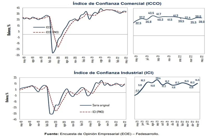 23 de junio de 2022En mayo el Índice de Confianza Comercial (ICCO) se ubicó en 39,0%, lo que representa el mismo valor del índice frente al mes pasado y un incremento de 6,5 pps respecto a mayo de 2021, según la Encuesta de Opinión Empresarial de Fedesarrollo.