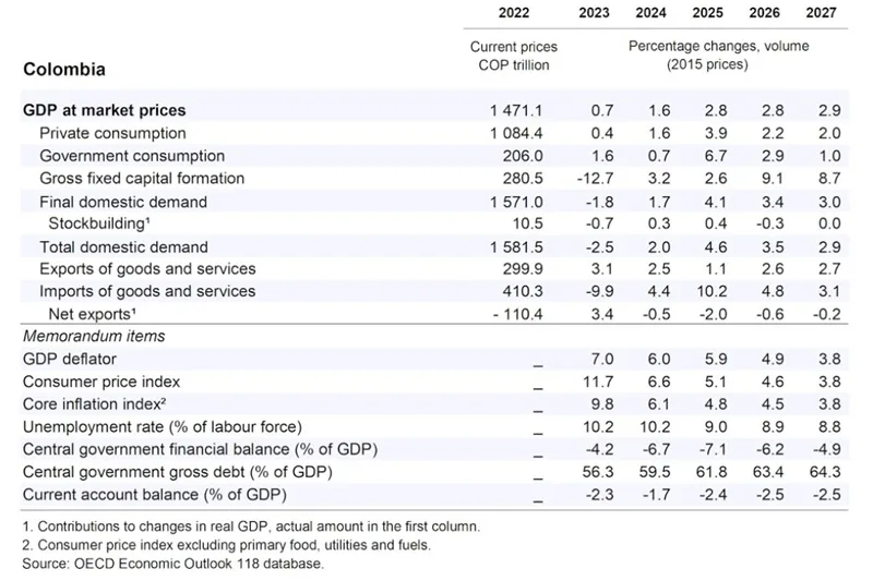 (EFE).- La Organización para la Cooperación y el Desarrollo Económico (OCDE) revisó al alza la proyección de crecimiento para Colombia, de 2,5 a 2,8 % este año, y de 2,6 a 2,8 % en 2026, según su informe semestral de Perspectivas, divulgado este martes.