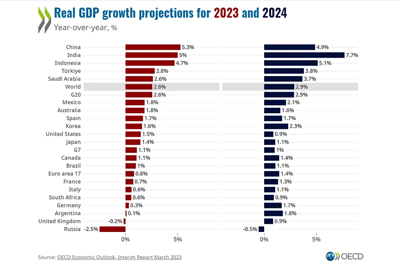 El crecimiento de la economía mundial fue del 3,2% en 2022 y la organización, con sede en París, proyecta un 2,6% para este año y un 2,9% para el próximo, cuatro y dos décimas más que en su precedente estimación de noviembre, respectivamente.