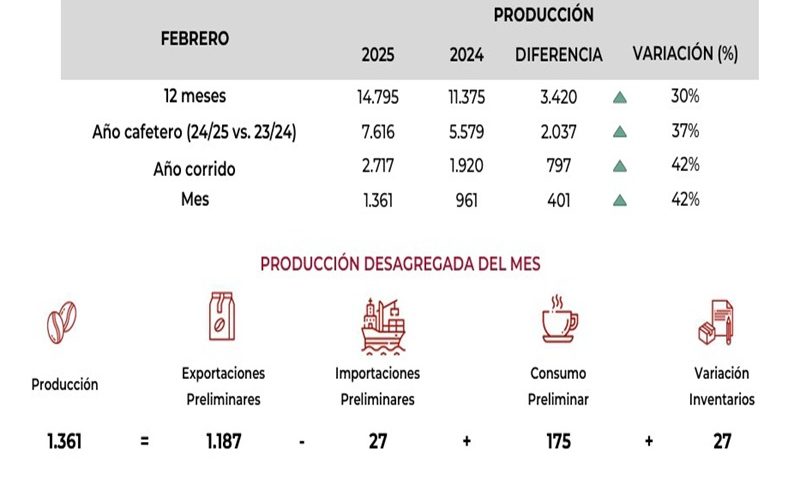 Según la Federación de Cafeteros, en febrero de este año se produjeron 1,36 millones sacos, lo que también supone una variación positiva del 42 % frente a los 961.000 sacos de febrero de 2024.