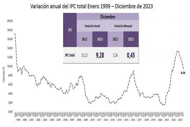 En diciembre de 2023 la variación anual del IPC fue 9,28%, lo cual se explicó principalmente por la variación anual de las divisiones Alojamiento, agua, electricidad, gas y otros combustibles y Transporte, según el Dane.