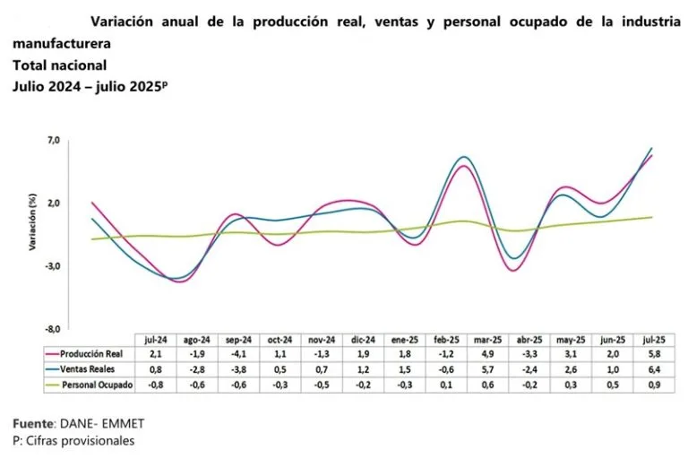 En julio, la producción real de la industria manufacturera presentó una variación de 5,8%, las ventas reales de…