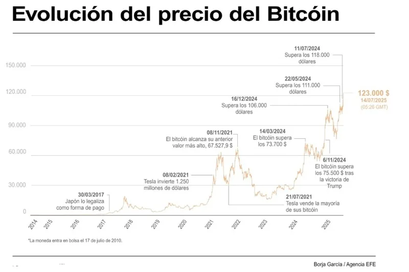 (EFECOM).- El bitcóin ha alcanzado un nuevo máximo histórico al superar los 123.000 dólares este lunes y ha…