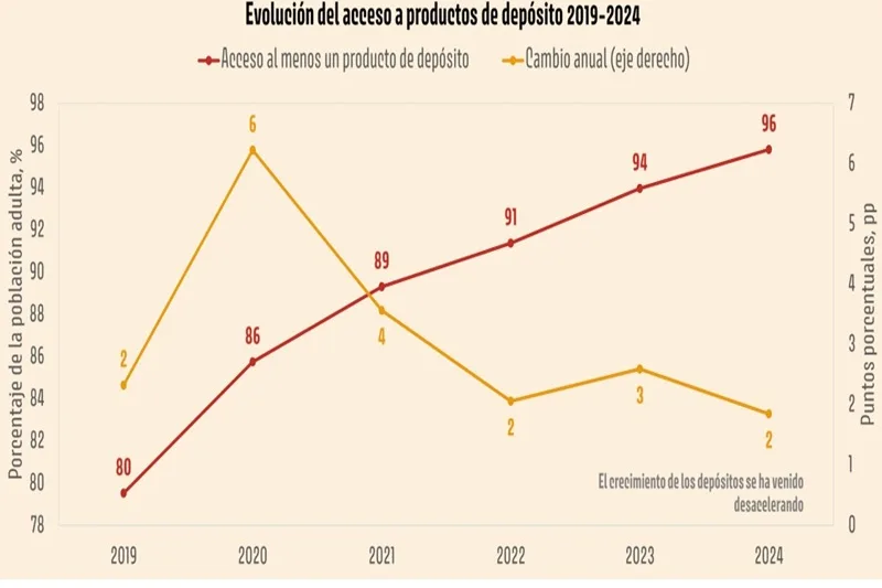 En 2024, el porcentaje de adultos que tenía al menos un producto de depósito o crédito aumentó 1,7…