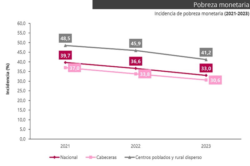 En 2023, el 33% de los colombianos estaba en condición de pobreza monetaria, lo cual representa una disminución…
