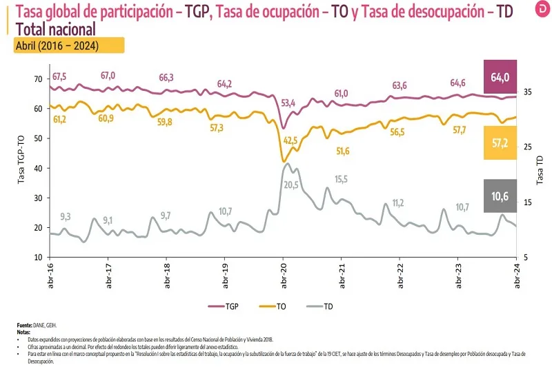 El Departamento Administrativo Nacional de Estadística (DANE) informó que en abril la tasa de desocupación para el total…