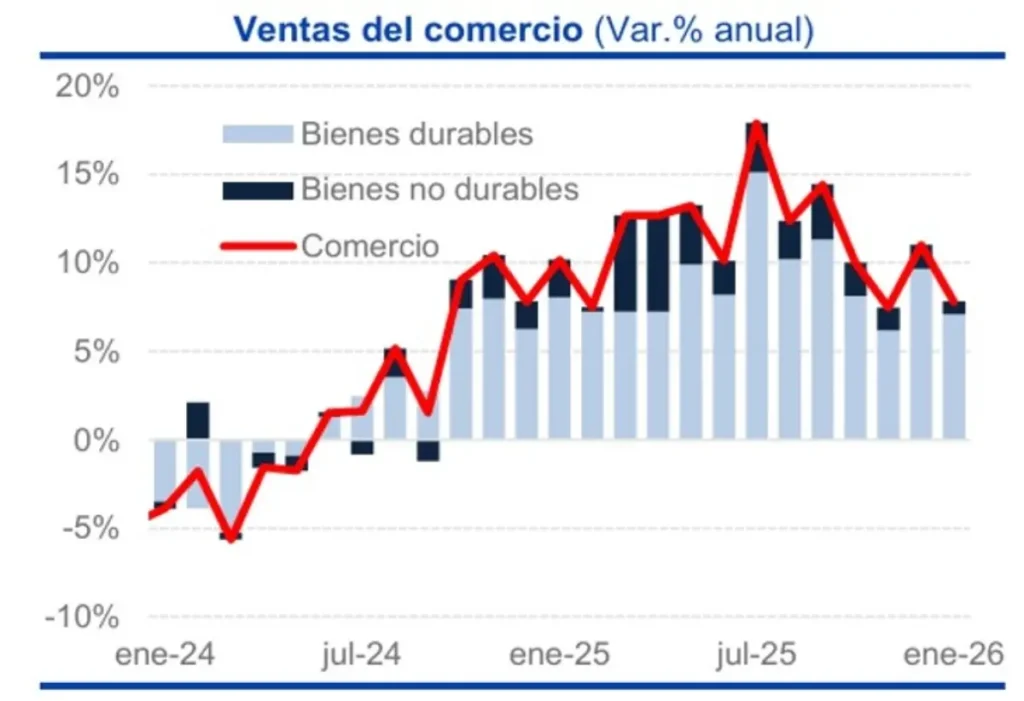 (Investigaciones económicas Banco de Bogotá).- En el arranque de 2026 los resultados de comercio minorista sorprendieron a la baja al consenso de analistas. Mientras el consenso esperaba una expansión anual del comercio de10.0%, el crecimiento observado fue de 7.8%, el segundo crecimiento más bajo en los últimos 12 meses.