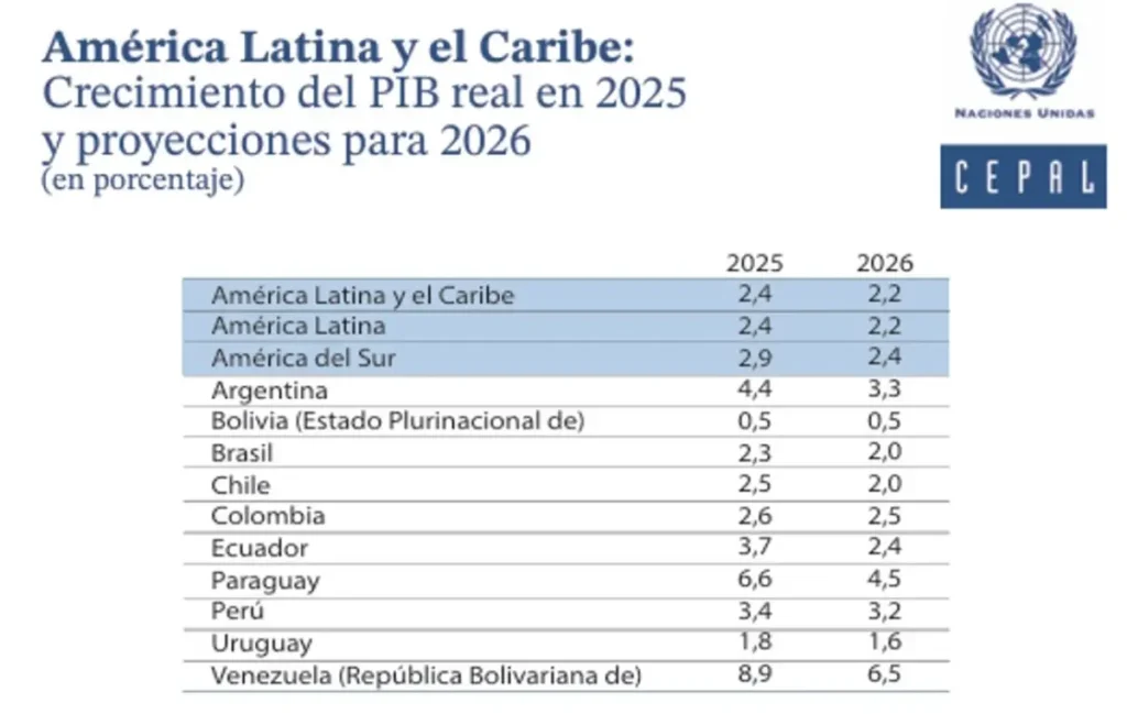 Según la comisión económica regional de las Naciones Unidas, el menor dinamismo proyectado se observa de manera generalizada. En 24 de los 33 países de la región se desaceleraría el crecimiento en 2026, mientras que solo siete (7) mostrarían una aceleración. En conjunto, de concretarse esta proyección, la región completaría cuatro años consecutivos con tasas de crecimiento cercanas al 2,3%, evidenciando un patrón de baja capacidad para crecer.