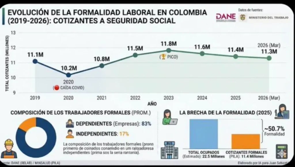 La UGPP reporta 12.844.462 cotizantes en febrero de 2024 y 12.972.258 en febrero de 2025; para septiembre de 2024 reporta 13.819.745; Para abril de 2025 reporta 13.271.487 Esto solo indica una caída de más de 500.000 empleos formales en ese periodo.