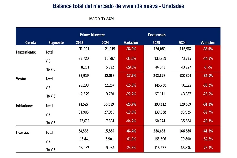 El líder gremial informó que entre enero y marzo del 2024 las ventas de vivienda registraron una contracción del -17,7 % frente mismo periodo de 2023, con un total 32.017 unidades comercializadas. Este valor, aseguró, es el más bajo en un primer trimestre en los últimos 15 años y se suma al mal desempeño de los lanzamientos (-34 %) y las iniciaciones (-26,7 %).