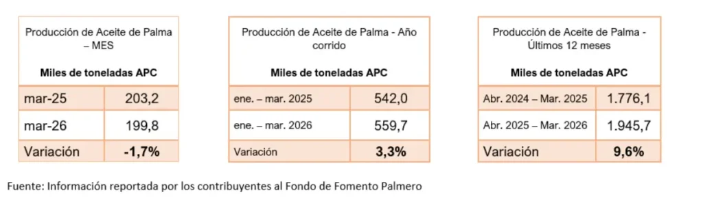 La producción de aceite de palma en Colombia mantiene una tendencia de crecimiento en lo corrido de 2026. Entre enero y marzo el país produjo 560 mil toneladas, lo que representa un incremento del 3% frente al mismo periodo de 2025.