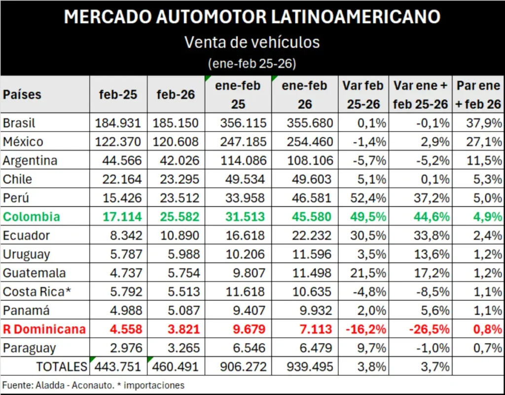 En el segmento de vehículos livianos, República Dominicana, Costa Rica y Argentina fueron los países que reportaron mayor caída interanual en febrero de 2026 (20,4%, 6,8% y 6,0% respectivamente).