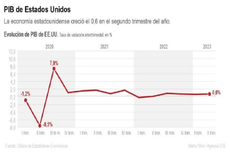 (EFE).- La economía estadounidense registró en el segundo trimestre del año un crecimiento del 0,6 % con respecto al trimestre anterior, según el primer cálculo del Producto Interior Bruto del país publicado este jueves por la Oficina de Estadísticas Económicas.