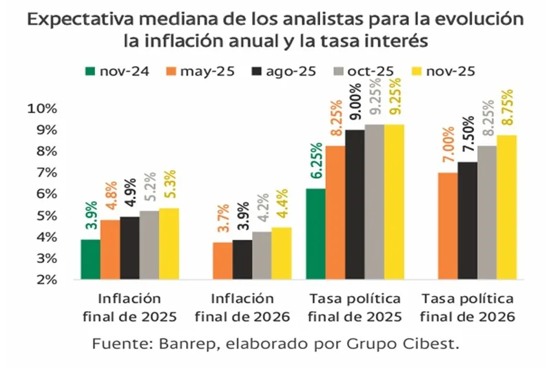 En particular, consideramos que la decisión estaría sustentada en la persistencia de la inflación. Si bien en noviembre se desaceleró en 21 puntos básicos (pb) hasta 5,30% anual – como consecuencia de una variación mensual de 0,07% -, el registro aún se ubica por encima del cierre del 2024. Así, en lo corrido del año la inflación solo ha caído 10 pb, lo que evidencia que el proceso de convergencia hacia el rango de tolerancia ha sido nulo. Además, resaltamos que los próximos registros se verían afectados por presiones alcistas derivadas de la alta indexación y el ajuste de tarifas reguladas.