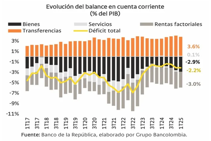 (Investigaciones económicas Bancolombia).- El déficit de la cuenta corriente de Colombia se amplió levemente hasta 2,2% del PIB, equivalente a USD2.290 millones, en el primer trimestre de 2025. Este resultado marca una nueva tendencia de desbalances superiores a 2,0% del PIB. La -casi-estabilización del déficit respecto al 4T24 (solo aumentó 0,02 puntos porcentuales; pp en adelante) correspondió a un aumento del desbalance comercial de bienes y servicios.