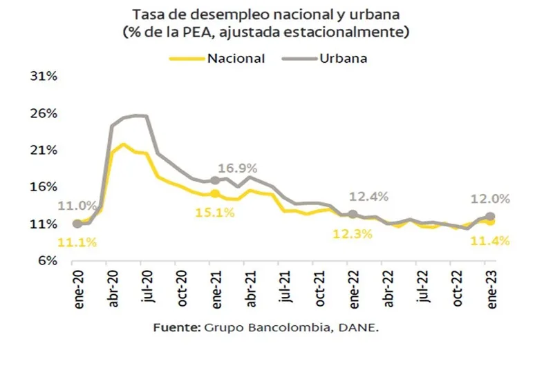 Con lo anterior en mente, en las series originales el deterioro del desempleo fue mucho mayor, toda vez que el avance anual de los ocupados se desaceleró mientras la participación en el mercado laboral creció. En concreto, a nivel nacional la incidencia del desempleo se elevó hasta 13,7%, mientras a nivel urbano avanzó a 14,5%. Lo anterior, si bien se explica en buena medida por el comportamiento estacional normal de enero, también hace palpable la retadora coyuntura económica en términos de la menor actividad productiva, la elevada inflación y el endurecimiento de las condiciones financieras.