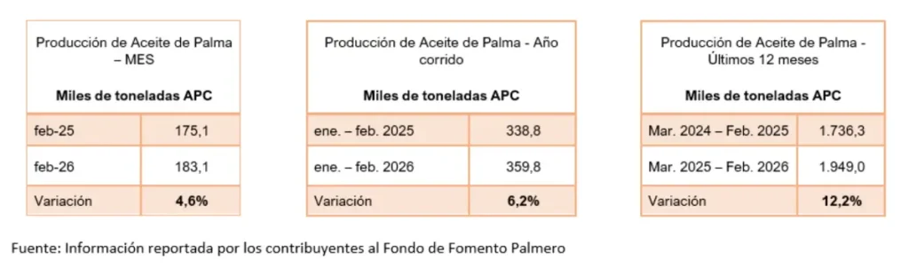 La producción de aceite de palma en Colombia continúa mostrando un comportamiento positivo en 2026. Durante el primer bimestre del año el país tuvo una producción de aceite de palma de 360 mil toneladas, lo que representa un crecimiento del 6% frente al mismo periodo de 2025, cuando se produjeron 339 mil toneladas.