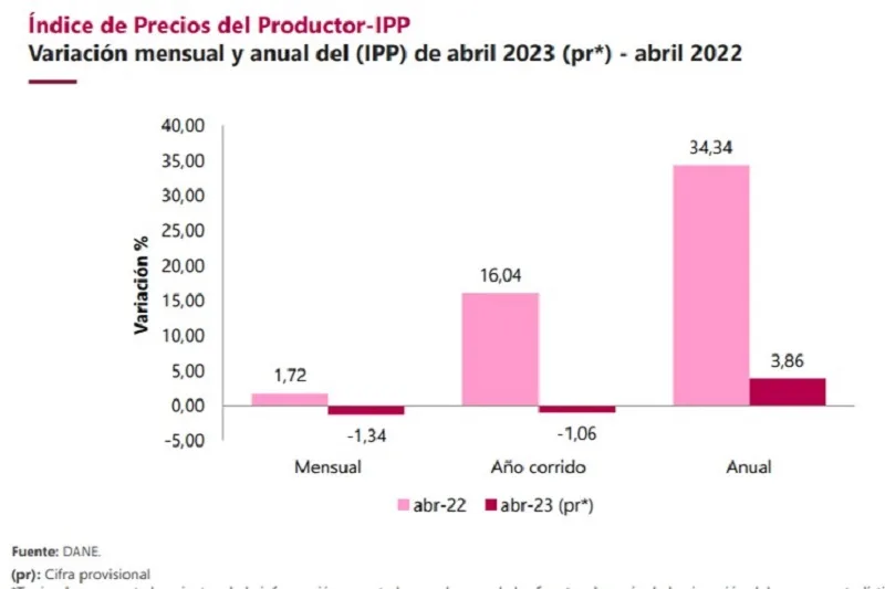 En abril de 2023 el IPP de la producción nacional presentó una variación anual de 3,86% comparado con abril de 2022. En abril de 2023 comparado con abril de 2022 los sectores de Agricultura, ganadería y pesca (11,33%) e Industria (10,36%) presentaron variaciones superiores a la media (3,86%), mientras que el sector de Minería (-18,58%) fue el único que registró una variación inferior a la media.