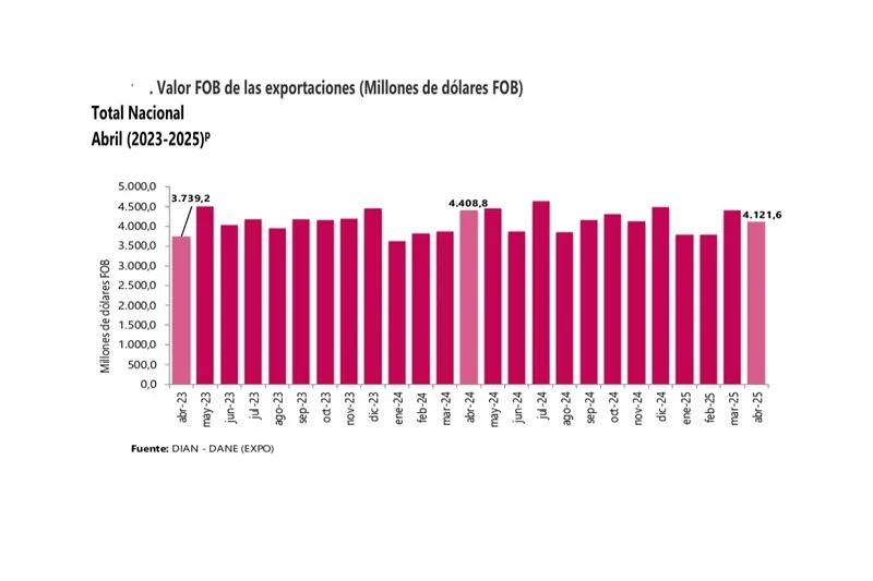 De acuerdo con la información de exportaciones procesada por el DANE y la DIAN, en abril de 2025 las ventas externas del país fueron US$4.121,6 millones FOB y presentaron una caída de 6,5% en relación con abril de 2024; este resultado se debió principalmente a la caída de 33,0% en las ventas externas del grupo de Combustibles y productos de industrias extractivas.