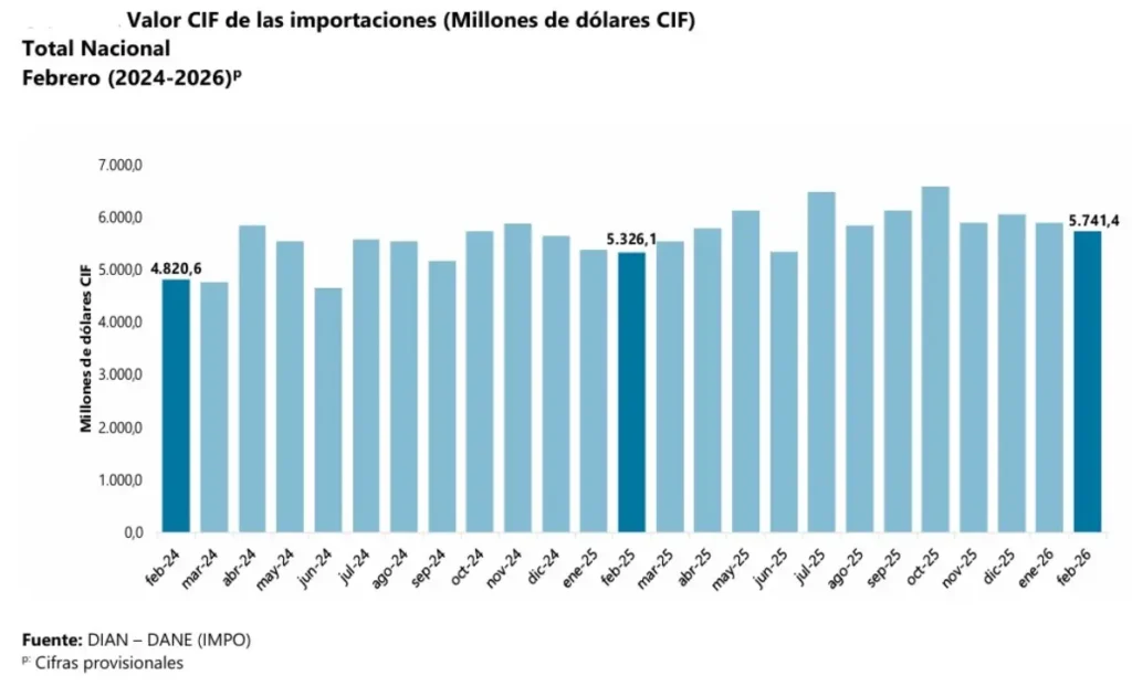 De acuerdo con las declaraciones de importación registradas ante la DIAN en febrero de 2026, las importaciones fueron US$5.741,4 millones CIF y presentaron un crecimiento de 7,8% con relación al mismo mes de 2025. Este comportamiento obedeció principalmente al aumento de 13,2% en el grupo de Manufacturas.