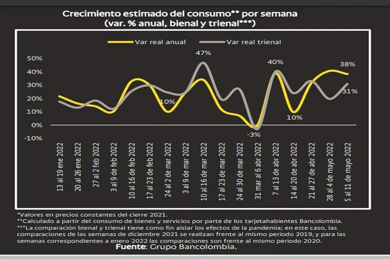 18 de mayo de 2022Consumo con tarjetas de Bancolombia creció 38% en la semana del 5 al 11 de mayo frente al mismo periodo de 2021. En este caso hay un efecto base como consecuencia del paro nacional y un buen comportamiento en 2022 asociado a la celebración del Día de la Madre.