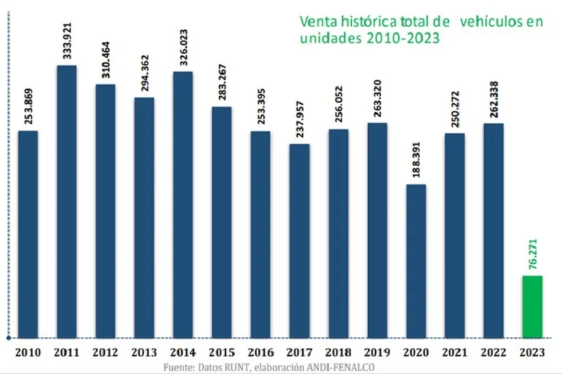 En mayo de 2023, la venta de vehículos de carga decrece el 40,5%, respecto a mayo del 2022. A cierre de mayo de 2023, las ciudades que presentan mayor caída en el registro de vehículos son Barranquilla con 44%, Bucaramanga con el 34%, Cali con 34% y Bogotá con 33%.