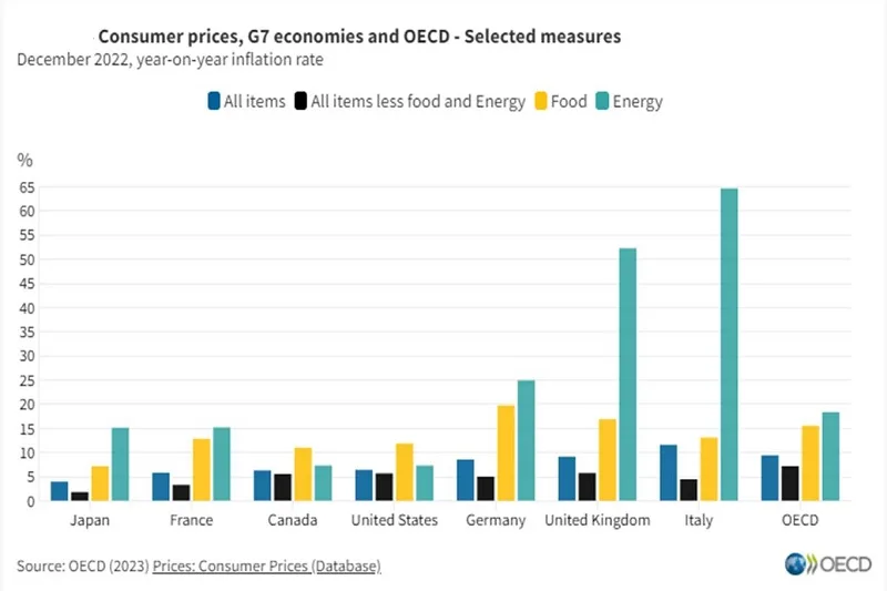 La inflación interanual en la OCDE se situó en el 9,4 % al terminar diciembre, tras el segundo descenso mensual consecutivo desde el pico del 10,8 % en octubre. Eso significa que es el nivel más bajo desde abril de 2022.
