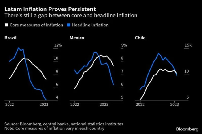 La inflación general puede estar cayendo en respuesta a los precios más bajos productos básicos, la caída de los costos de los alimentos y apreciación de la moneda regional. Pero el panorama no es tan halagüeño como parece cuando se excluyen elementos volátiles como los alimentos y la energía, y es poco probable que la inflación alcance los objetivos de los bancos centrales en toda la región hasta fines de 2024, dijo Fernández.
