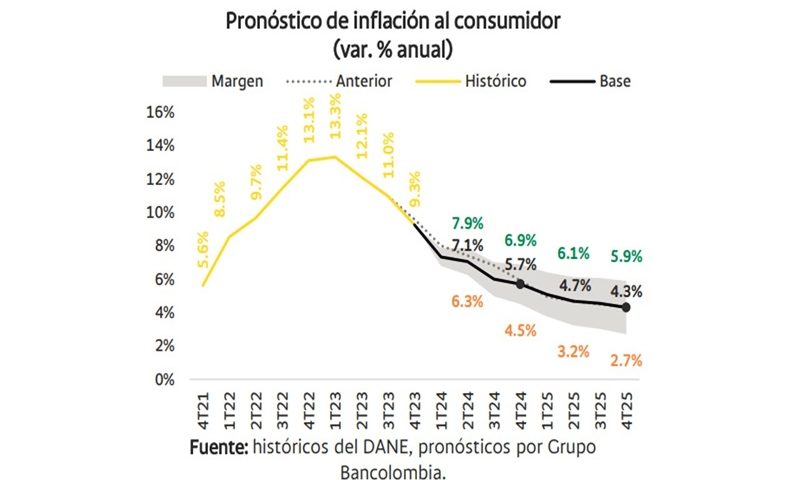 No obstante, los riesgos persisten respecto a posibles afectaciones climáticas en alimentos (una potencial La Niña durante el 2S24), el ajuste esperado en los precios del ACPM, la elevada indexación y el tenso panorama geopolítico. Si bien la inflación anual de alimentos se ha incrementado, el aumento adicional frente a los niveles más recientes sería limitado, gracias al efecto estadístico y lo transitorio de los choques climáticos. Entre tanto, será clave evidenciar menores presiones desde los arriendos, las facturas de servicios públicos y gradualidad en los aumentos discrecionales en el precio del ACPM.