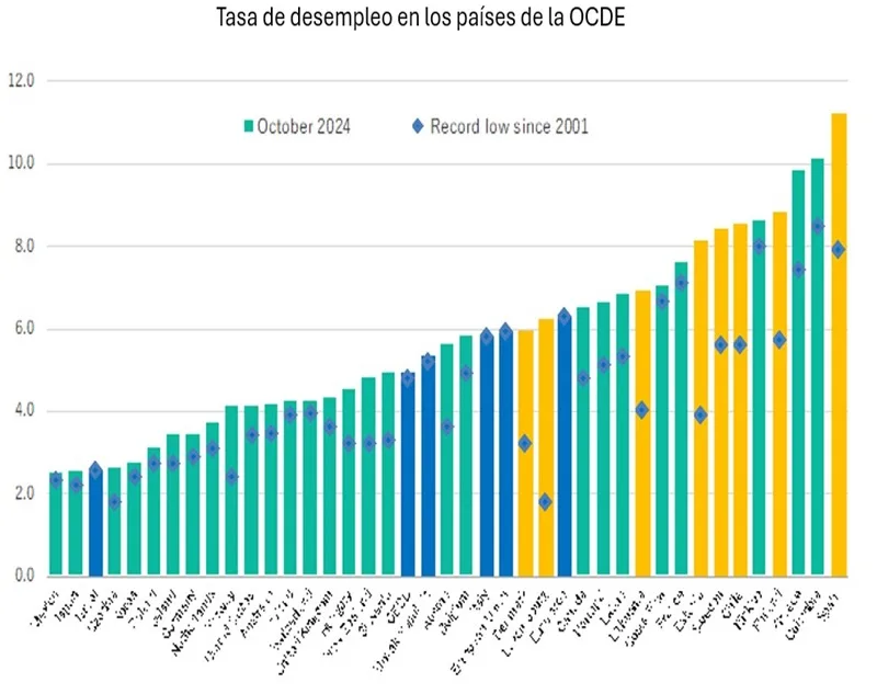 En comparación con septiembre, las tasas de desempleo de octubre no variaron en 19 países de la OCDE, disminuyeron en 7 y aumentaron en 5. Cinco países de la OCDE registraron una tasa de desempleo inferior al 3,0%; solo Colombia y España registraron una tasa de dos dígitos a pesar de la tendencia en España.