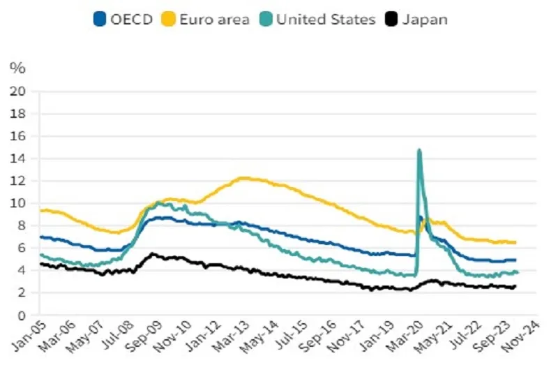 La tasa de desempleo de la OCDE se mantuvo estable en el 4,9% en marzo de 2024, continuando por debajo o en un 5,0% durante los dos últimos años.