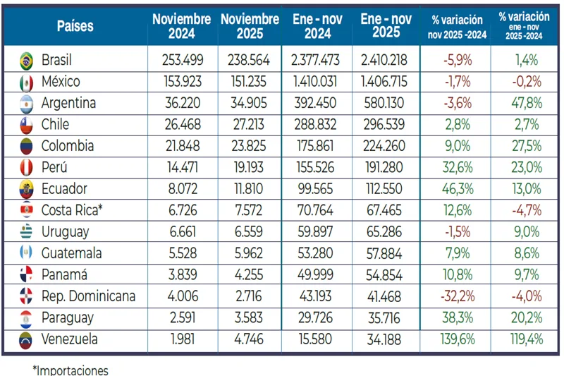 En el segmento de vehículos livianos (pasajeros para Venezuela), República Dominicana, Brasil y Argentina fueron los países que reportaron mayor caída interanual en noviembre de 2025 (31,7%, 5,8% y 3,5% respectivamente).
