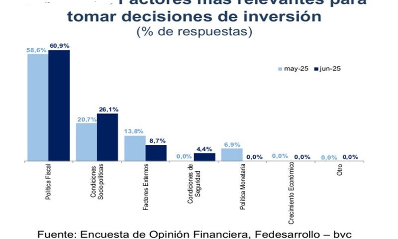 18 de junio de 2025La política fiscal se mostró como el aspecto más relevante a la hora de invertir, al ser elegido por el 60,9% de los analistas (frente al 58,6% en el mes anterior), según la Encuesta de Opinión Financiera de Fedeesarrollo y BVC.