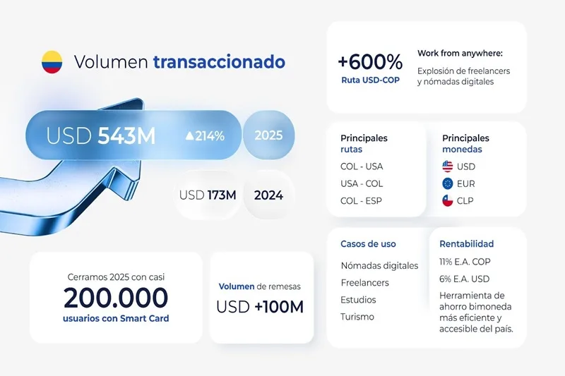 En el caso de Colombia, la fintech evidencia un cambio profundo de mentalidad por parte de sus clientes frente a la diversificación de monedas, ya que pasó de ser una alternativa financiera a convertirse en una necesidad operativa. Como resultado, se movilizaron cerca de USD 543 M y se incrementó en un 600 % el flujo USD a COP.