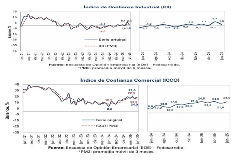 En junio, el Índice de Confianza Industrial (ICI) se situó en 1,5%, con una disminución de 4,6 pps respecto al mes anterior (ICI mayo 2025: 6,1%), mientras que aumentó en 4,6 pps frente a junio del 2024 (ICI junio 2024: -3,1%), según la Encuesta de Opinión Empresarial de Fedesarrollo.
