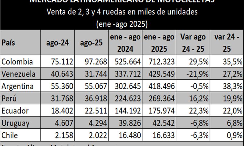 Por otro lado, en el segmento de motocicletas de tres ruedas, Colombia, Perú y Uruguay mostraron aumentos interanuales del 69,6%, 31,2% y 30,8%, respectivamente, al comparar con agosto del año pasado. Ningún país decreció.