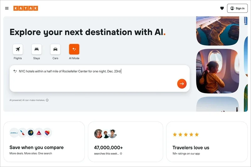 KAYAK, el motor de búsqueda de viajes líder en el mundo, lanzó AI Mode,una experiencia de búsqueda en lenguaje natural que combina los datos de KAYAK con ChatGPT para ofrecer resultados más inteligentes y contextuales, directamente desde la página de inicio. KAYAK es el primer sitio web de viajes importante que permite a los usuarios planificar viajes completos escribiendo preguntas directamente en un cuadro de búsqueda.