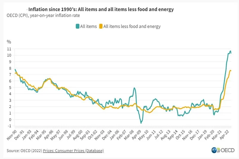 La inflación interanual en la OCDE medida por el Índice de Precios al Consumidor (IPC) cayó al 10,3%…