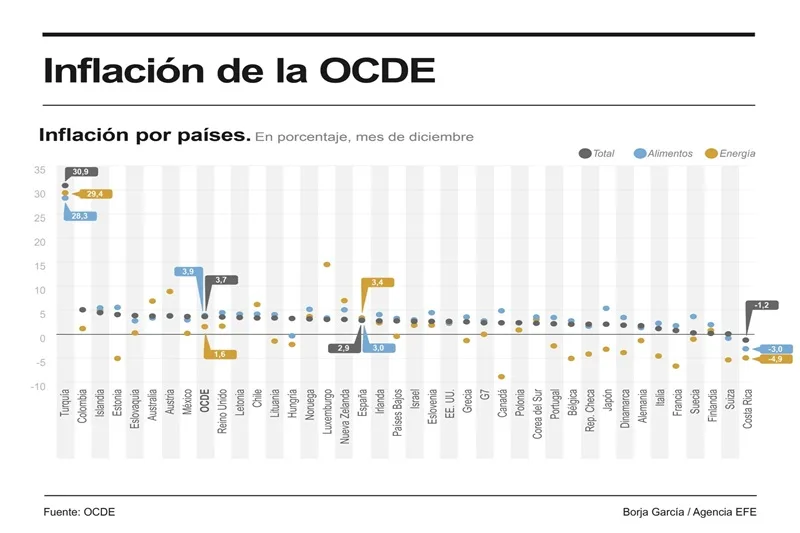 La inflación interanual en los países de la OCDE se mantiene en el 3,7 % en diciembre