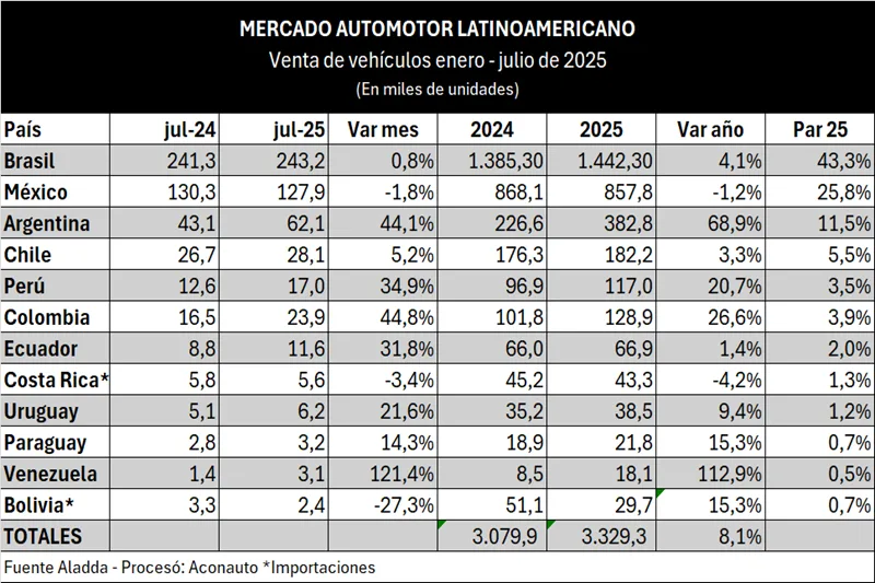 Mercado automotor latinoamericano creció 7% en 2025