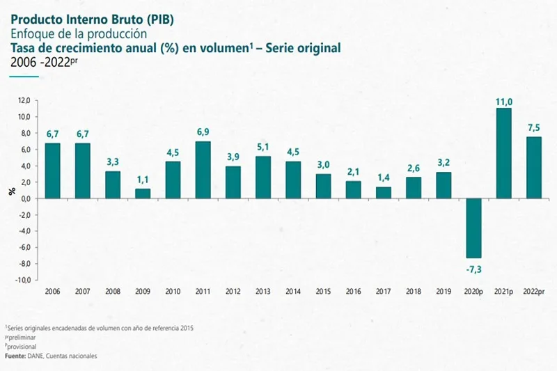 Economía de Colombia crece 7,5% en 2022, por consumo doméstico