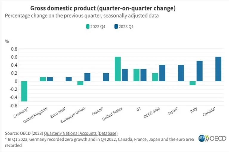 El producto interior bruto (PIB) de la OCDE aumentó un 0,4% intertrimestral en el primer trimestre de 2023,…