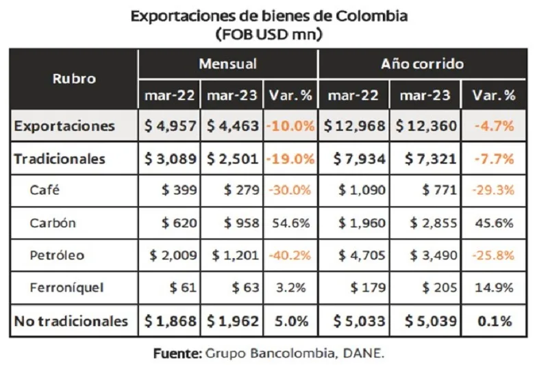 (Investigaciones económicas Bancolombia).- Las exportaciones de bienes sumaron USD4.463 millones FOB en marzo, con lo que registraron la…
